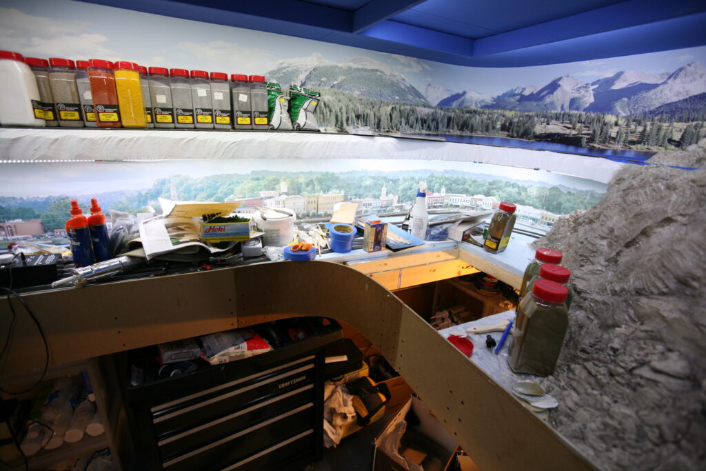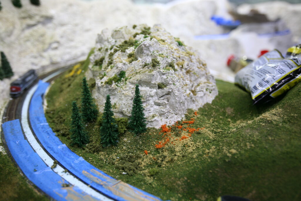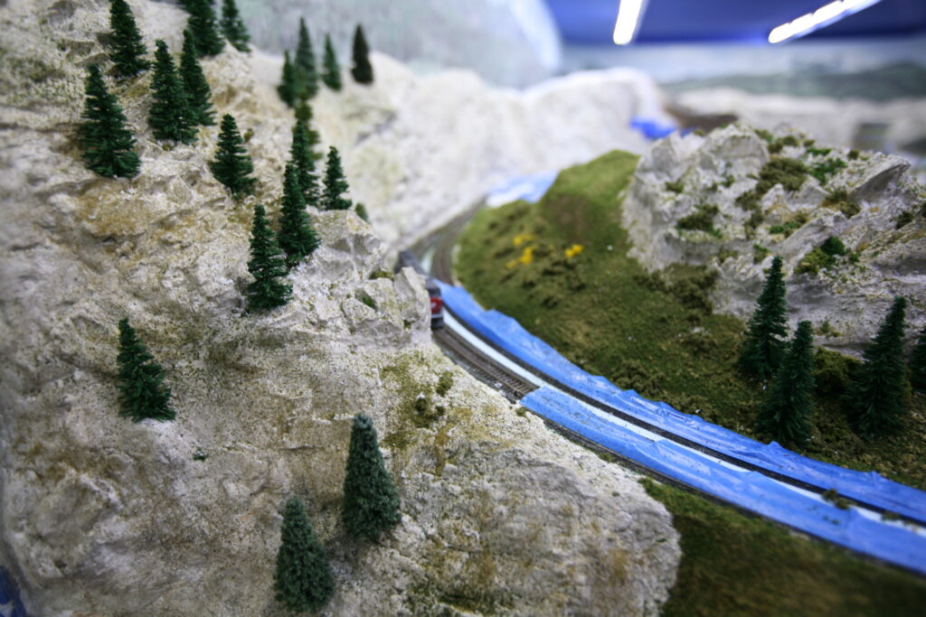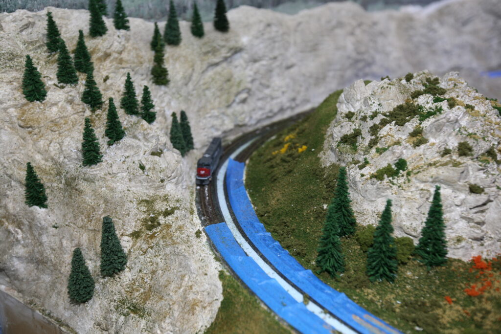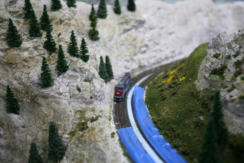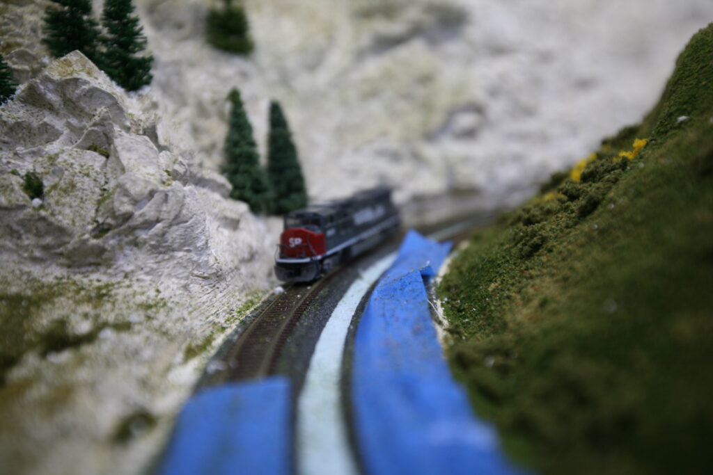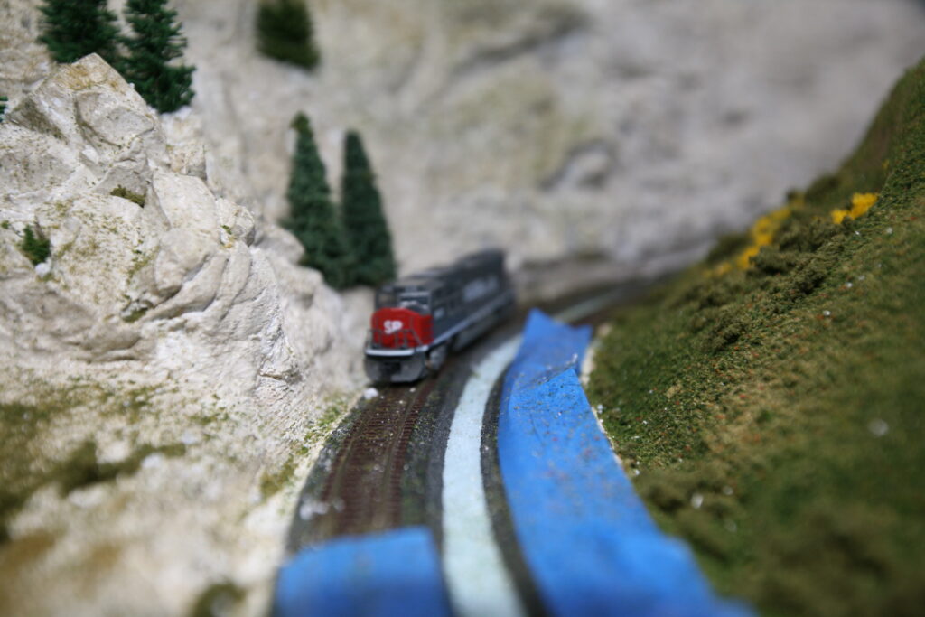 Follow a garden railroad journey from Tehachapi to Donners Pass, weaving through rocks, living plants, and miniature trees inspired by nature.